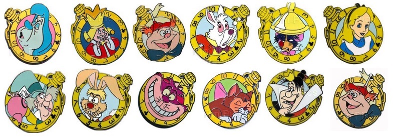 Disneyland Cast Lanyard Series 4 Alice in Wonderland Collection features Alice's head and upper chest in the White Rabbit's gold pocket watch. Small Mickey head icon on the right. Clock numbers 1, 4, 5, 6, 7, 8, 9, 10, 11, 12 shown around the edge. Silver metal, 1 1/16" diameter round pin.